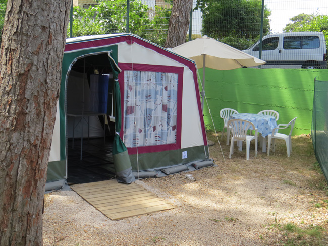 Tents are placed in the shade of pine trees, only 110 meters from the beach. ABC agency reception is 55 m, sanitary facility 50 m, restaurants and shops 150 m, city center 250 m, sports grounds 80 m away from the tents.